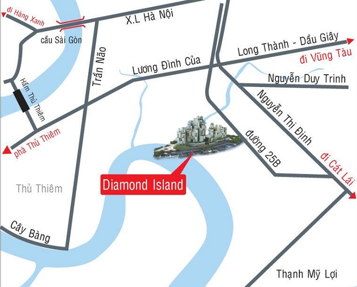 Căn hộ Đảo Kim Cương (Diamond Island Apartment) cách quận 1 chỉ 10 phút, Đảo Kim Cương tọa lạc tại vị trí liền kề khu đô thị mới Thủ Thiêm – trung tâm mới của Tp. HCM trong tương lai.