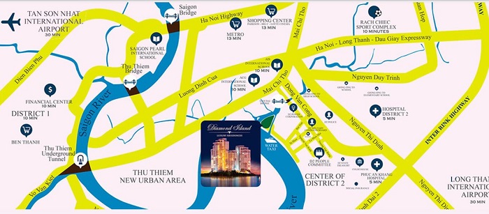 Căn hộ Đảo Kim Cương liền kề ngay Khu dân cư Huy Hoàng phường, Thạnh Mỹ Lợi Quận 2, gần ngay Ủy Ban Nhân Dân và trung tâm Hành chính của Quận, dễ dàng kết nối với cầu Phú Mỹ nối Phú Mỹ Hưng và Quận 2.