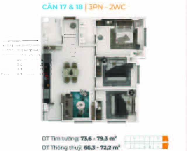 Căn hộ 3 phòng ngủ có diện tích 73,6m2. Căn hộ có phòng khách, 3 phòng ngủ, 2 vệ sinh