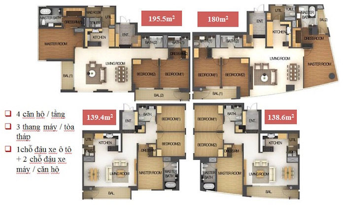 Căn hộ thường tầng 4-25: 144m2 - 145m2 - 185m2 - 201m2