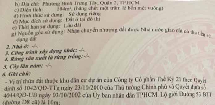 Vị trí: Dự án đất Thế Kỷ 21, lô đất mặt tiền đường số 53 và đường Lê Hữu Kiều, phường Bình Trưng Tây, Tp. Thủ Đức.