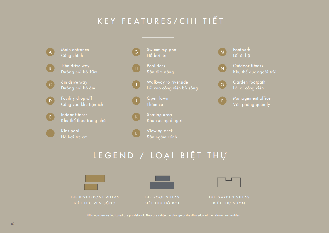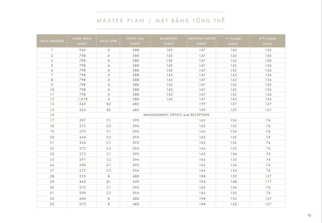 Tồng diện tích 2,7 ha, gồm có 29 căn biệt thự. 11 căn biệt thự ven sông, 06 căn biệt thự hồ bơi sân vườn và 12 căn biệt thự sân vườn.