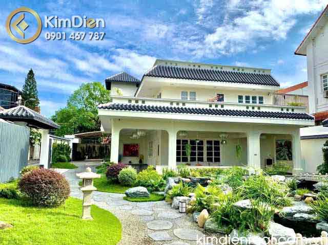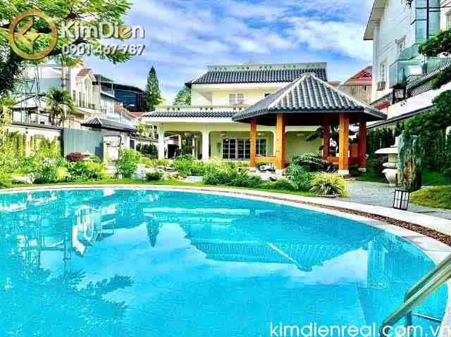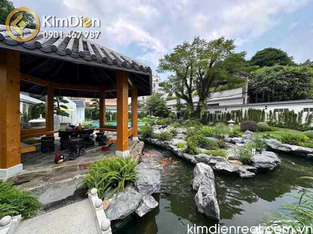 Biệt thự xây dựng đẹp gồm 1 trệt, 1 lầu, có hồ bơi rộng, sân vườn nhiếu cây xanh, hồ cá tiểu cảnh