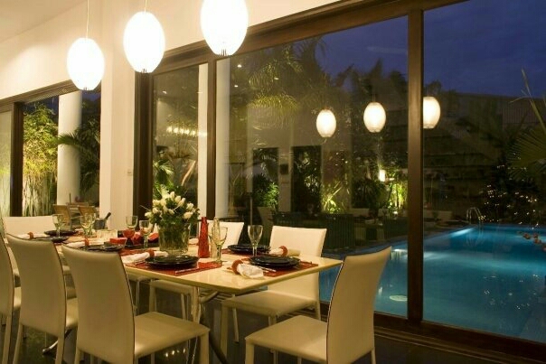 Biệt Thự khu Thảo Điền được xây dựng hướng Đông Nam, hồ bơi rộng, đẹp, phòng khách nhìn trực diện hồ bơi cây xanh.