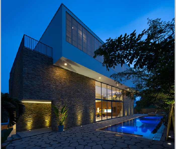 Biệt thự được thiết kế theo phong cách hiện đại, với cửa kính từ sàn tới trần, view nhìn trực diện hồ bơi, sân vườn tạo một không gian thư giãn, nhẹ nhàng cho gia chủ.