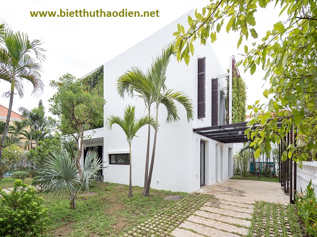 Biệt thự quận 2 là một tác phẩm kiến trúc gần gũi với thiên nhiên được xây dựng trong khuôn viên đất rộng 823m2, với những mảng tường màu xanh ngay mặt tiền ngôi nhà. Ngay từ bước chân đầu tiên, chúng ta như được hòa mình vào không gian thiên nhiên, của hoa lá, của cây cỏ. Đặc biệt, thoạt nhìn đầu tiên ngôi nhà như một khối màu trắng được trang trí, một cách khéo léo gia chủ lồng ghép nhẹ nhàng hai bức tường xanh tuyệt đẹp ở mặt trước và mặt sau của ngôi nhà, mang lại sự riêng tư cho gia chủ.