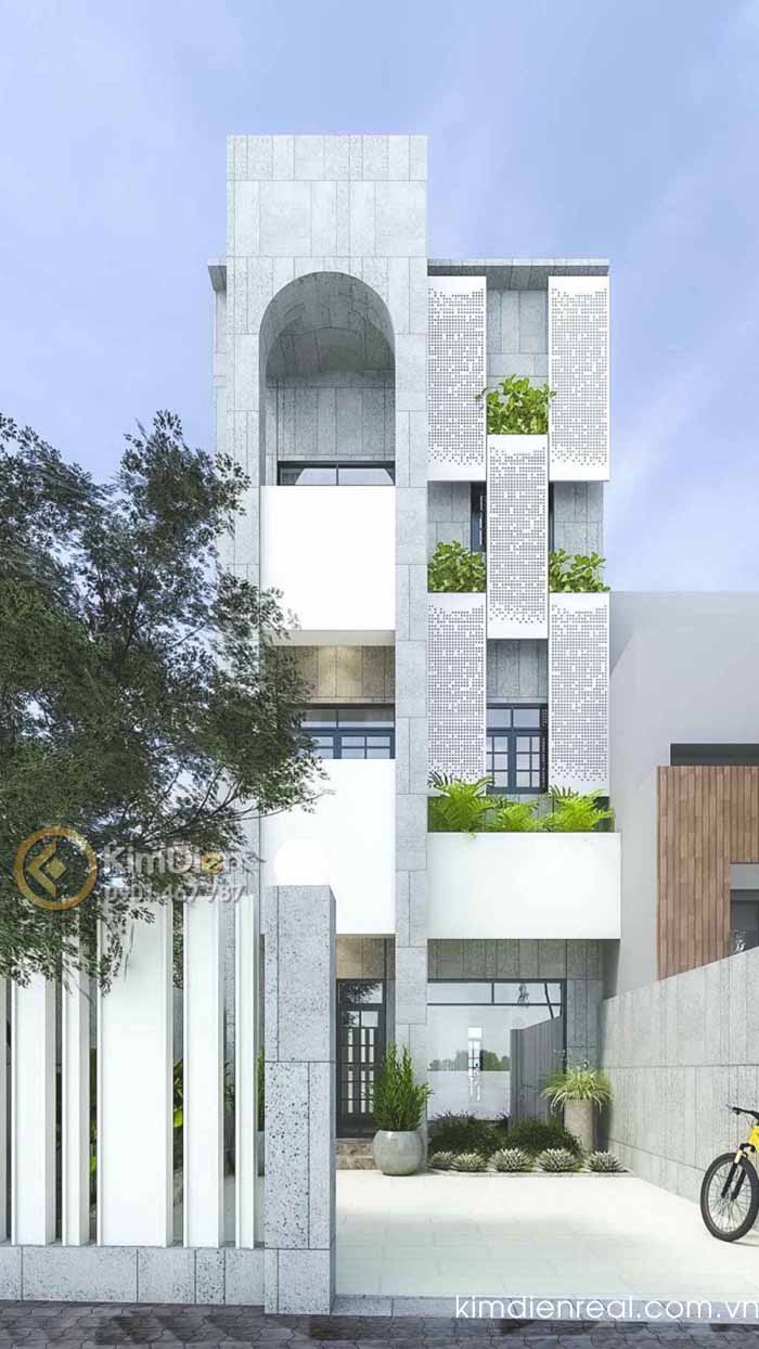 Nhà phố thiết kế kiến trúc hiện đại gồm: 1 trệt, 2 lầu, áp mái, sân thượng, sân trước nhà rộng
