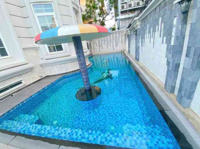 Kết cấu xây dựng 1 hầm, 4 tầng, sân thượng. Thang máy, thang bộ, sân vườn hồ bơi rộng.